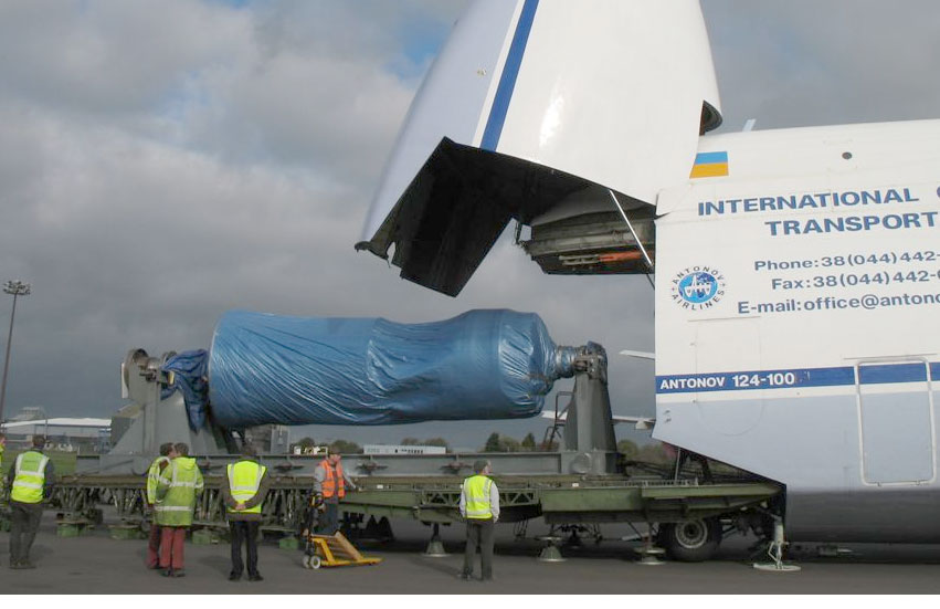 100te rotor shipped per An-124 the worlds largest commercial aircraft into Stansted and offloaded from aircraft using a lift system due to high winds preventing use of cranes.